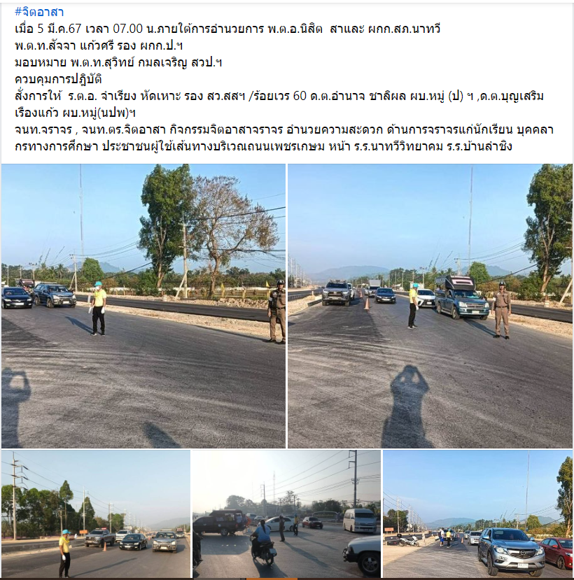 จนท.จราจร , จนท.ตร.จิตอาสา กิจกรรมจิตอาสาจราจร อำนวยความสะดวก ด้านการจราจรแก่นักเรียน บุคคลากรทางการศึกษา ประชาชนผู้ใช้เส้นทางบริเวณถนนเพชรเกษม หน้า ร.ร.นาทวีวิทยาคม ร.ร.บ้านลำชิง