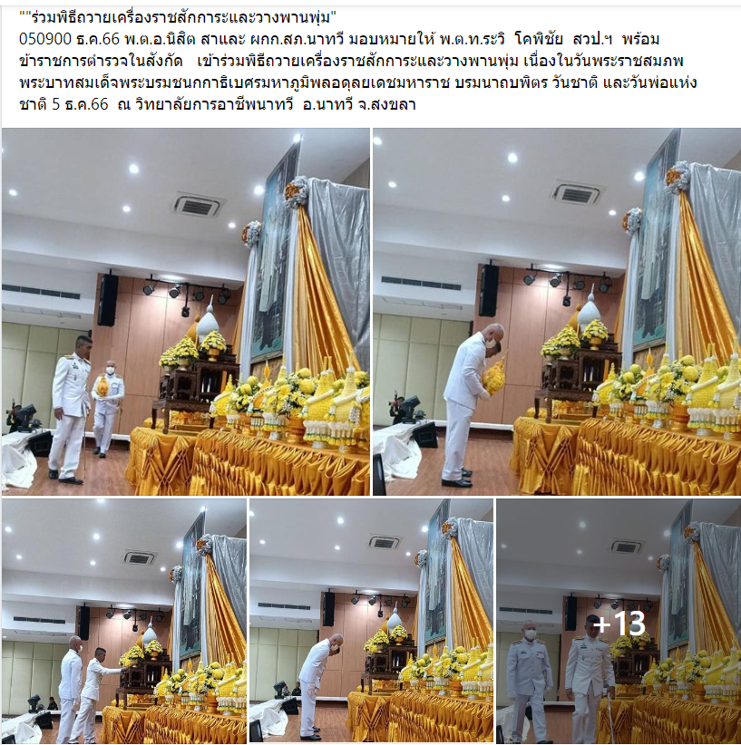 ร่วมพิธีถวายเครื่องราชสักการะและวางพานพุ่ม เนื่องในวันพระราชสมภพ พระบาทสมเด็จพระบรมชนกกาธิเบศรมหาภูมิพลอดุลยเดชมหาราช บรมนาถบพิตร วันชาติ และวันพ่อแห่งชาติ 5 ธ.ค.66 ณ วิทยาลัยการอาชีพนาทวี